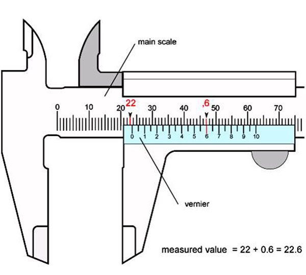 * خواندن مقیاس اصلی: ابتدا عددی که خط صفر ورنیه (قسمت متحرک) از آن عبور کرده یا دقیقاً روی آن قرار گرفته است، را از روی مقیاس اصلی (خطکش ثابت، برحسب میلیمتر یا اینچ) بخوانید. این عدد، مقدار اصلی اندازهگیری است.